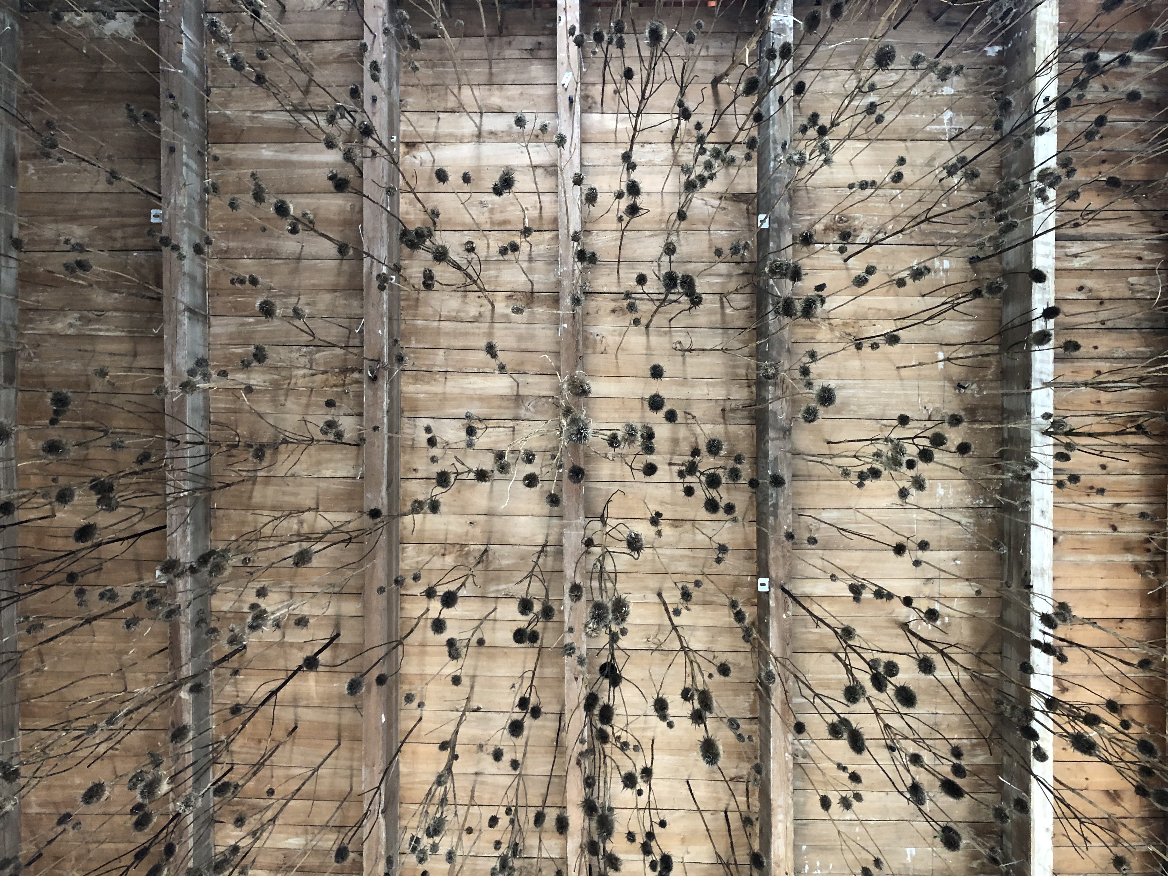 About 1800 stems of wilted thistle (carder), fixed to the ceiling of an unused building in the city center of Melle, France.