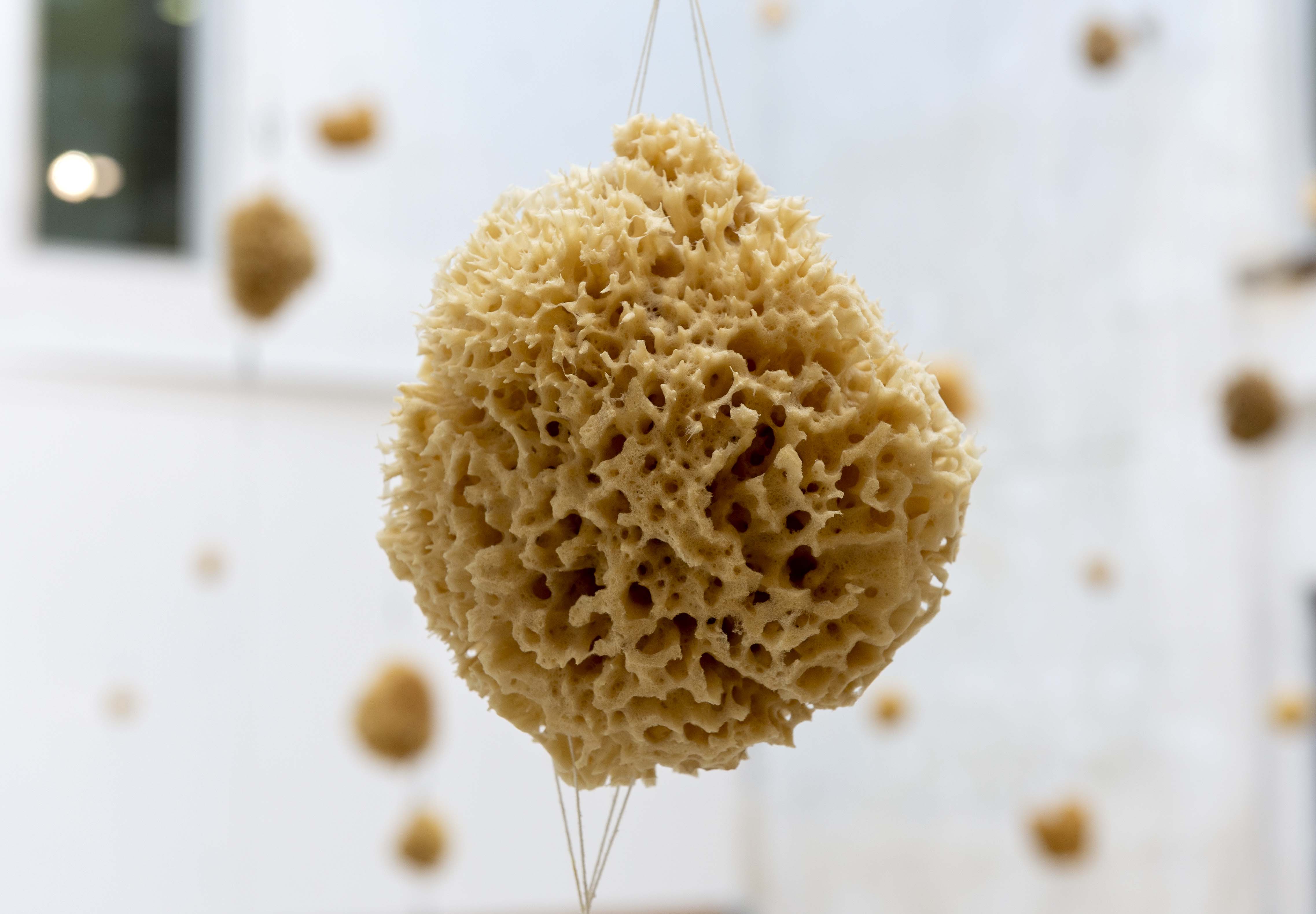 Questions of balance are at the center of Constellation ordinaire #11 (Après, la mer s’est évaporée), meaning : Ordinary Constellation #11 (After, the sea evaporated), specially designed for the glass roofed gallery of La Graineterie, contemporary art center in Houilles, close to Paris. Made of about fifty natural sea sponges, with astonishing and multiple shapes, this labyrinthine and floating installation offers a space to cross or to observe from multiple points of view. A wet sponge holds by its weight a second sponge close to the glass ceiling. By its evaporation and it's loss of weight it will eventually mount and consequently descent it's "partner sponge", thus producing movement and a changing appearance of the sponges in the space.