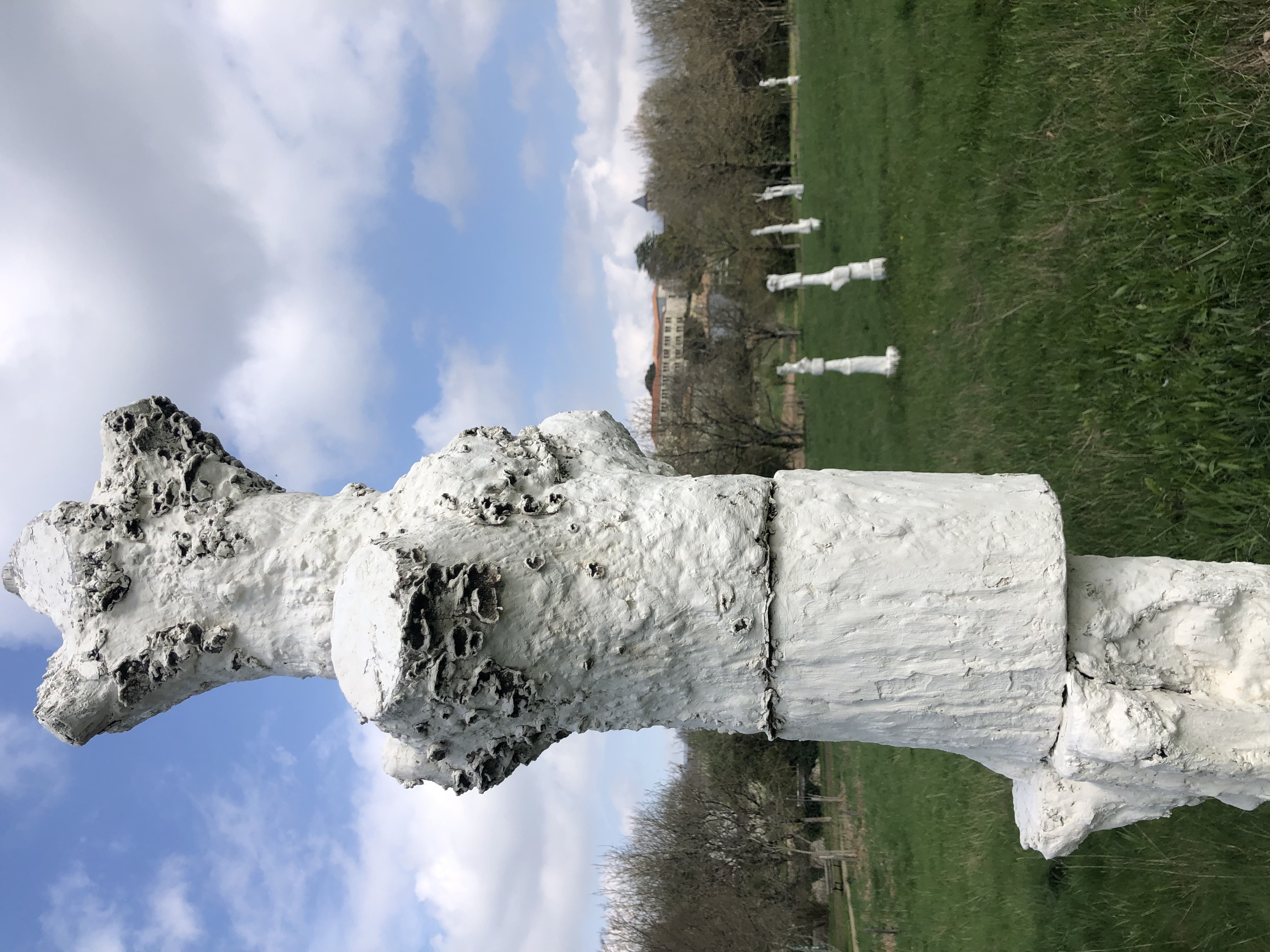 Carried onto a meadow, these fragmented and dislocated trees metamorphose into a more or less organized whole, a constellation of recomposed trunks whitewashed with arboricultural lime. Superimposed on segments of different diameters and wood species typical of the region (acacia, oak, birch and chestnut), the trunks stand like an impossible reconstruction of the forest they once formed. They stand as fragile witnesses to a land shaped by turbulent times.