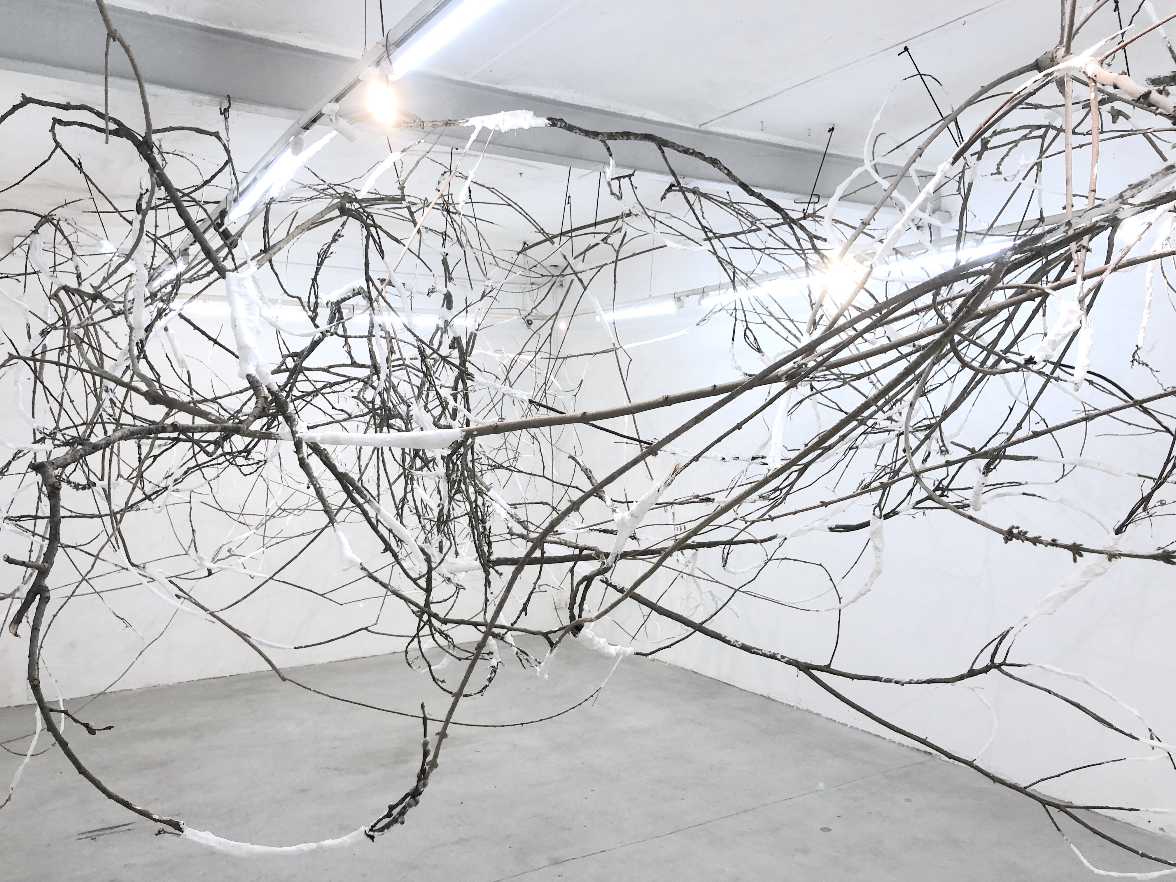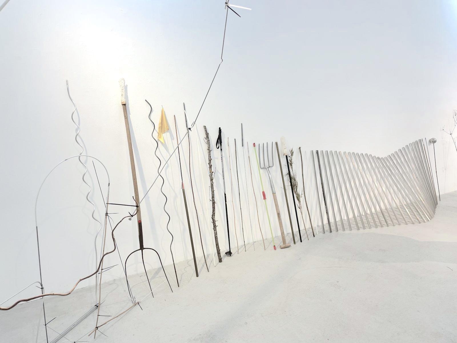 “A large ensemble” is a room-spanning installation that extends from floor to ceiling, from wall to wall. It consists of collected objects in the shape of pins, rods or sticks, such as curtain rods, rulers, fishing rods, walking sticks, pens, oars, branches, broomsticks, drumsticks, bicycle pumps, car aerials....